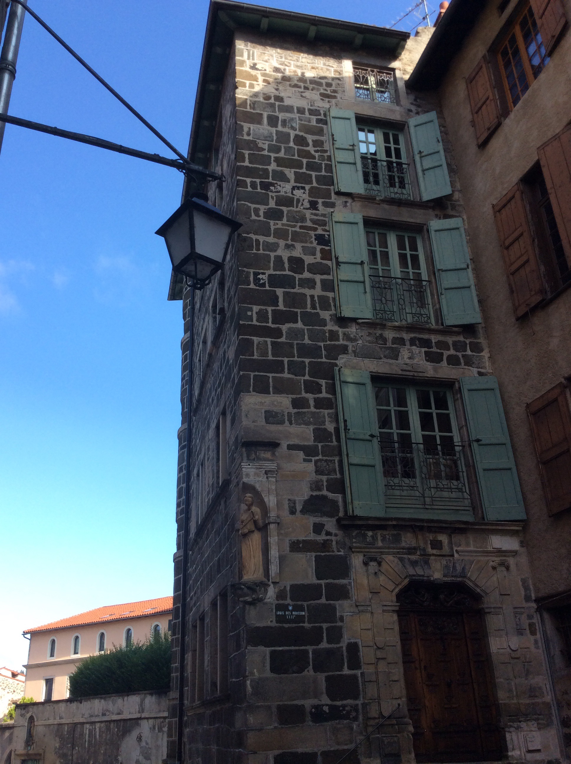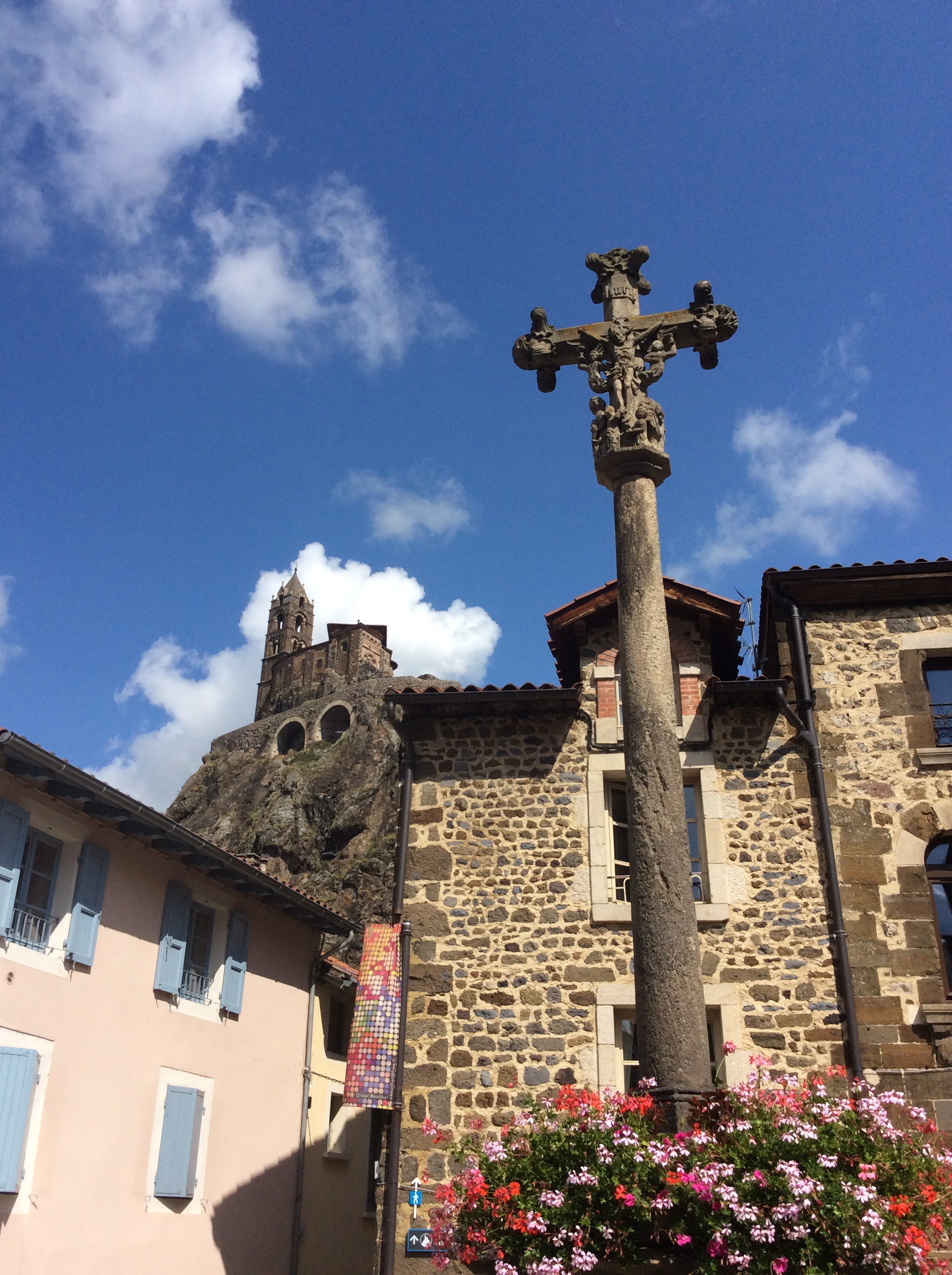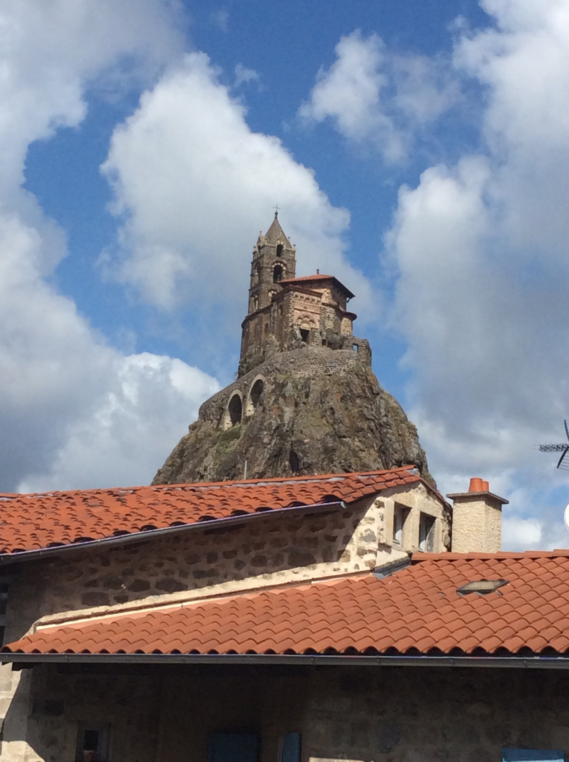 Yesterday I arrived in the city of Le Puy-en-Velay where I will begin the walking portion of my pilgrimage. After I settled in at my hotel, I conducted my first foray into the city. City plan in hand, I meandered my way through the medieval city center in a light rain to the the bottom of the steep street that leads to the steep steps of Cathedral Norte Dame du Puy. After conquering the slick cobblestone slope of the street, I triumphantly, and breathlessly, assented the stairs to be greeted by and incredible view of the city that was shrouded in grey. It will not be my only ascent to this august monument, for I make another ascent in the early morning of Monday where I will attend the pilgrim mass at 7 am. After which, I will then descend the steep slope and start the route, at least the start will be down hill.